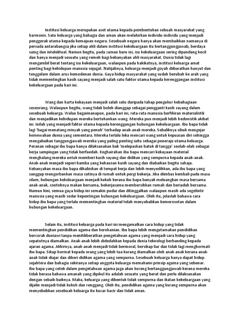 Contoh Karangan SPM. Namun di sebalik itu kita acap kali tersentak oleh pelbagai masalah yang menjadi factor hubungan. Disamping itu antara punca yang menyebabkan hubungan sesebuah keluarga menjadi renggang ialah disebabkan menteliti ibu bapa di Malaysia yang sempit.